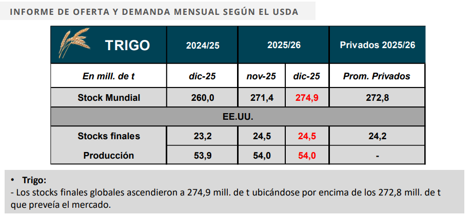 El trigo fue el cultivo que mostró el dato más contundente. El USDA elevó la producción mundial del ciclo 2025/26 en 9 millones de toneladas, llevándola a 837,8 millones. Como consecuencia, los stocks finales globales treparon a 274,9 millones de toneladas, por encima de lo que esperaba el mercado.