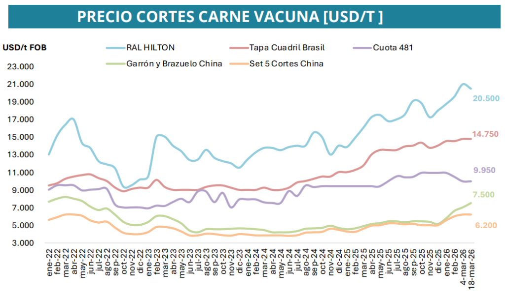 Uno de los puntos más destacados del informe es la estabilidad en los valores de los cortes premium. La cuota Hilton se mantiene en torno a los US$19.500 por tonelada, mientras que la cuota 481 ronda los US$15.500 por tonelada, confirmando la firmeza del mercado europeo.
