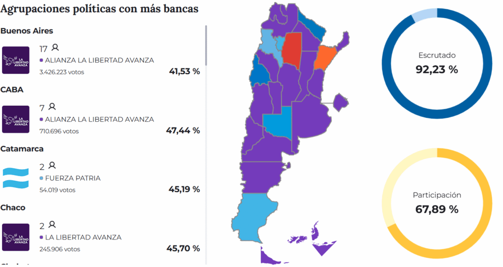 La Libertad Avanza (LLA), el espacio que lidera el presidente Javier Milei, obtuvo un triunfo contundente en las elecciones legislativas de 2025 y logró consolidar su posición de poder en el Congreso. La sorpresa más resonante se dio en la provincia de Buenos Aires, donde la lista encabezada por Diego Santilli logró imponerse frente al peronismo, revirtiendo una diferencia adversa de más de 14 puntos registrada apenas un mes y medio atrás en los comicios locales. Fuerza Patria fue la segunda fuerza consiguiendo un 31% de los votos, mientras que Provincias Unidas consiguió un 7%.