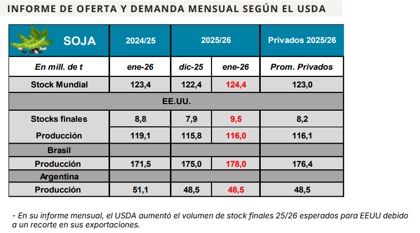 El mercado internacional de la soja arrancó 2026 con señales claras de abundancia, según se desprende del último informe mensual del Departamento de Agricultura de Estados Unidos (USDA). La combinación de una producción sudamericana en aumento y un nuevo ajuste alcista en los stocks finales estadounidenses volvió a ejercer presión sobre los precios, en un contexto donde la demanda no logra absorber el crecimiento de la oferta global.