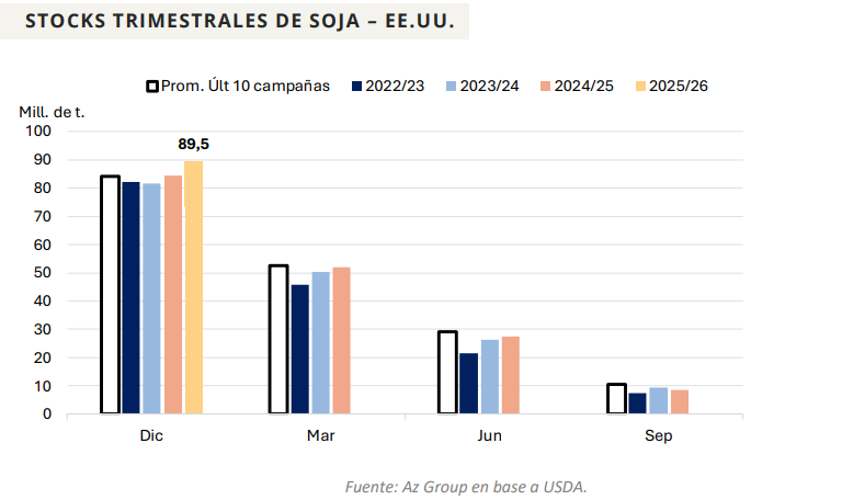 En su actualización de enero, el USDA elevó las existencias finales de soja en Estados Unidos para la campaña 2025/26 hasta 9,6 millones de toneladas, como consecuencia directa de un recorte en las exportaciones, que fueron ajustadas a la baja en 1,6 millones de toneladas. Con embarques proyectados en 42,9 millones de toneladas, el volumen queda muy por debajo del promedio de los últimos cinco años, lo que refuerza la lectura de un mercado más holgado.