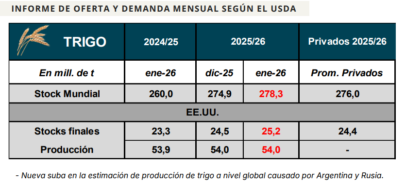 En el caso argentino, el USDA sorprendió con una fuerte corrección alcista. La producción nacional de trigo fue estimada en 27,5 millones de toneladas, lo que implica un aumento de 3,5 millones respecto del informe de diciembre. Este salto productivo se traduce, además, en una mejora sustancial de la capacidad exportadora: las exportaciones fueron incrementadas en 16 millones de toneladas, mientras que los stocks finales se ubicarían en torno a los 6 millones.